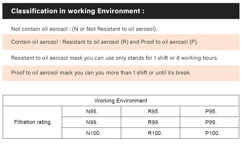 According to NIOSH (US Standard) and EN Standard disposable respirator have different classification. In NIOSH 42 CFR 84 have 2 classification, 1 is working environment and 1 is filter efficiency.
